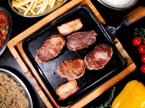 Acompanha arroz, vinagrete, batata frita e farofa.