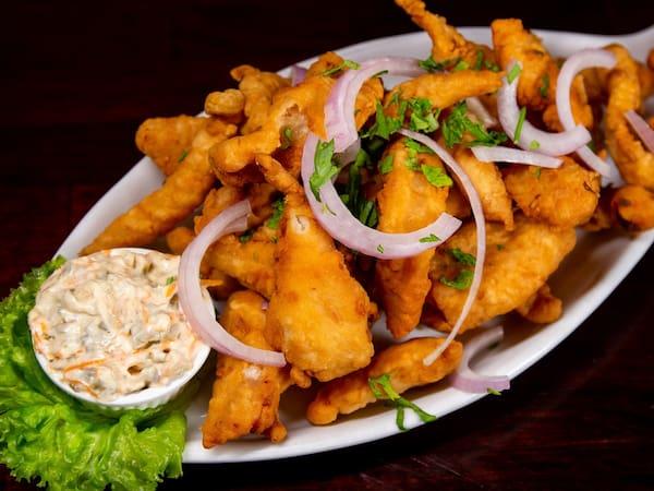 Cubos de peixe branco fresquinho deliciosamente empanados.